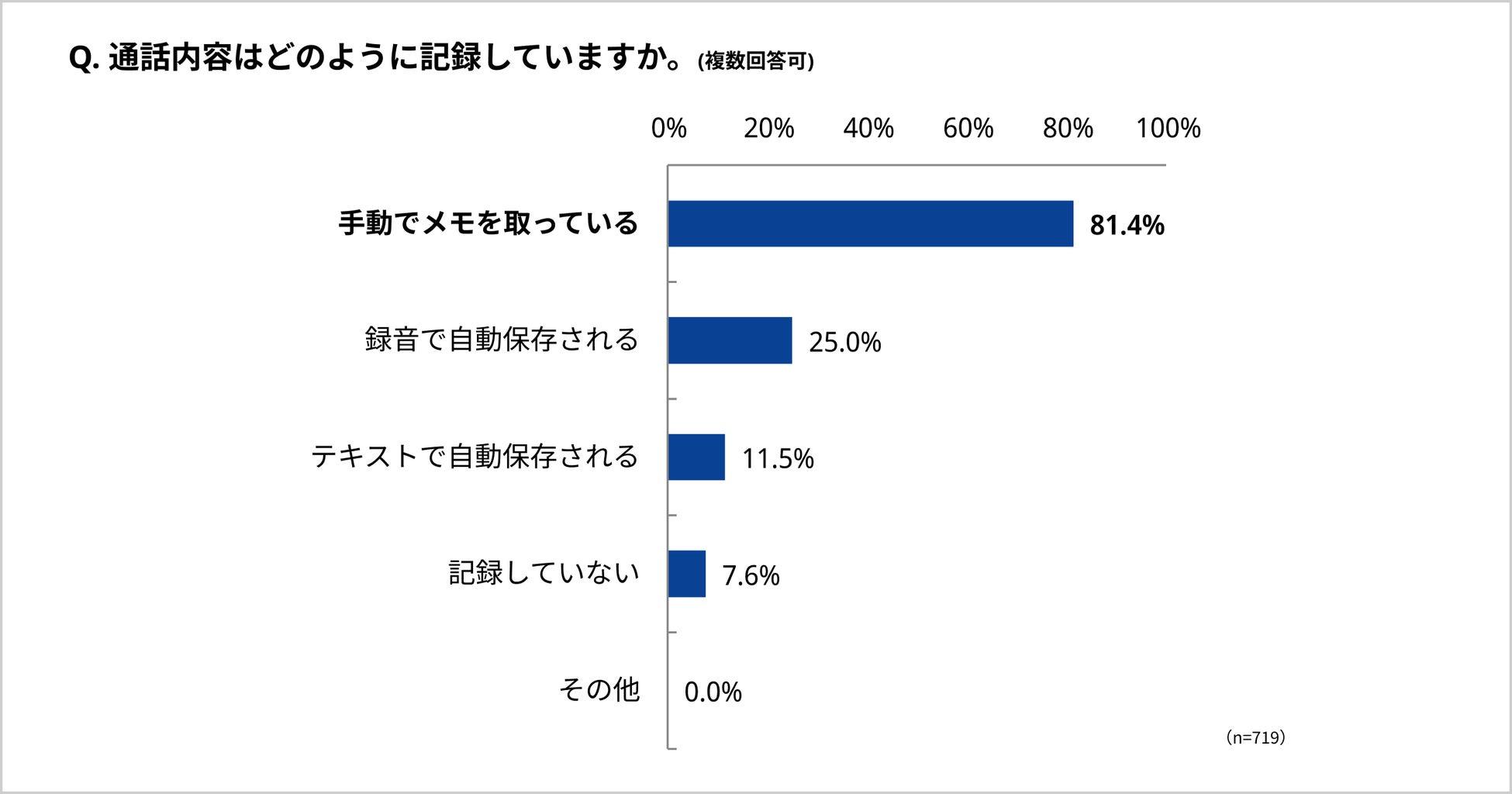 通話内容をどのように記録しているかという質問について、「手動でメモを取っている」と回答した人が81.4%と最も多い回答となりました。一方で「録音で自動保存される(25.0%)」「テキストで自動保存される(11.5%)」と回答した人は少ない結果となりました。