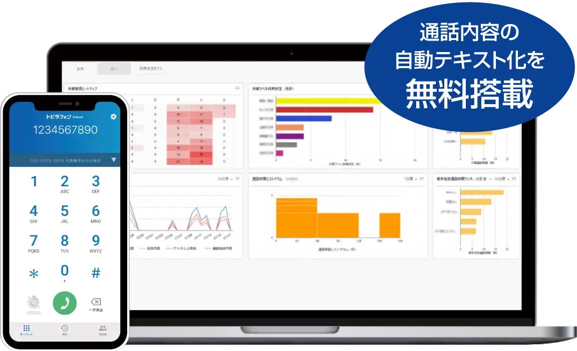 「トビラフォン Cloud」は、お持ちのスマートフォンに専用アプリをインストールすることで、市外局番や「050」で始まるIP電話番号を利用できるクラウド型ビジネスフォンです。外線・内線・転送・グループ着信・IVR(自動音声応答)・通話の文字起こしなど、ビジネスフォンに必要な機能を標準搭載しています。スマートフォンのほか、PCやIP電話機でも通話可能で、働き⽅に合わせた電話環境づくりを支援します。