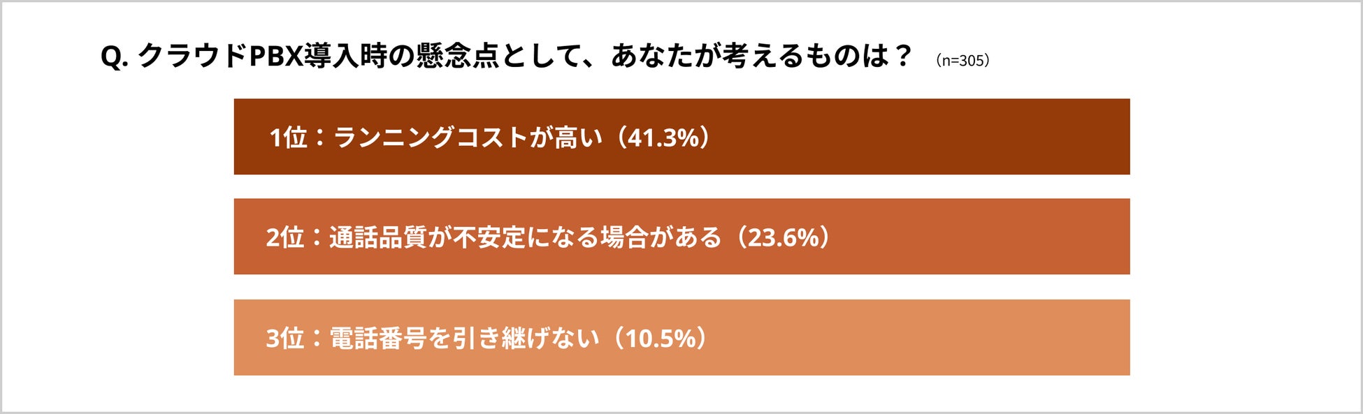クラウドPBXについて知っていると回答した人に対して、クラウドPBX導入時の懸念点を質問したところ、「ランニングコストが高い(41.3%)」が最も多い回答となりました。次いで、「通話品質が不安定になる場合がある(23.6%)」「電話番号を引き継げない(10.5%)」があげられました。