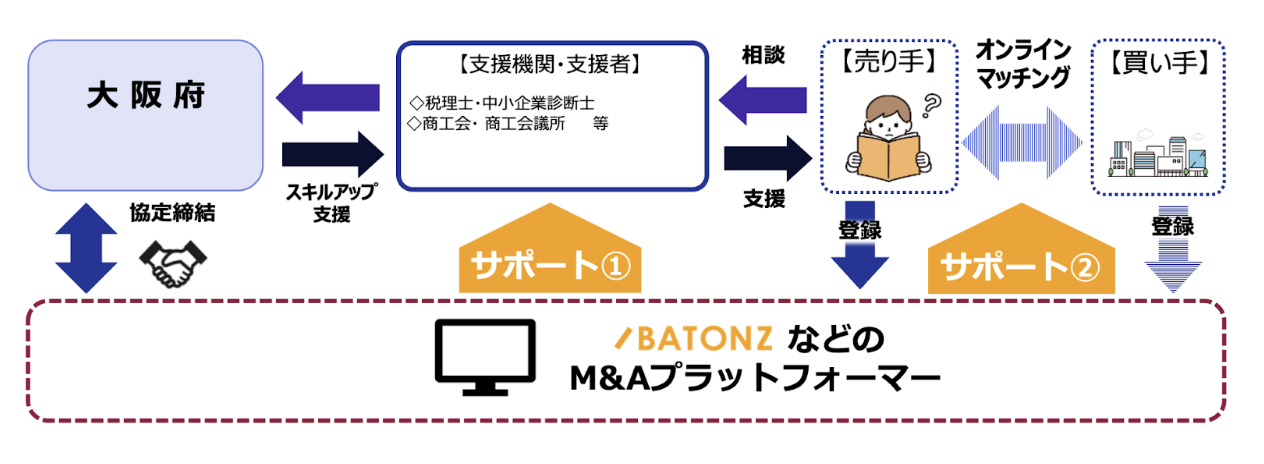 大阪府では、府内中小企業・小規模事業者の円滑な事業承継を促進するため、令和4年度より「経営資源移転円滑化支援事業(インターネット≪事業引継ぎ支援≫プロジェクト)」を実施しており、バトンズを始めとする民間M&Aプラットフォーマーと連携協定を締結することにより、大阪府内の中小企業・小規模事業者の方や支援機関・支援者の方向けに様々なサポートを実施します。