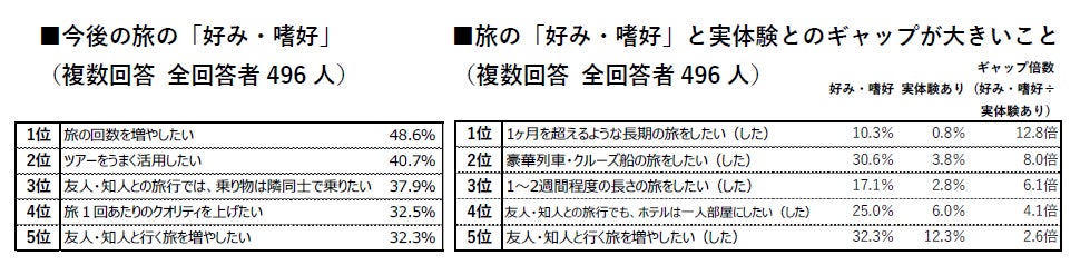 ・「好み・嗜好」と「実体験」との間に大きなギャップが見られたのは、「1ヶ月を超えるような長期の旅をしたい」(好み・嗜好:10.3%、実体験:0.8% で12.8倍差)と「豪華列車・クルーズ船の旅をしたい」(好み・嗜好:30.6%、実体験:3.8%で8.0倍差)といった、長く、ゆったり、贅沢なスタイルの旅となった。