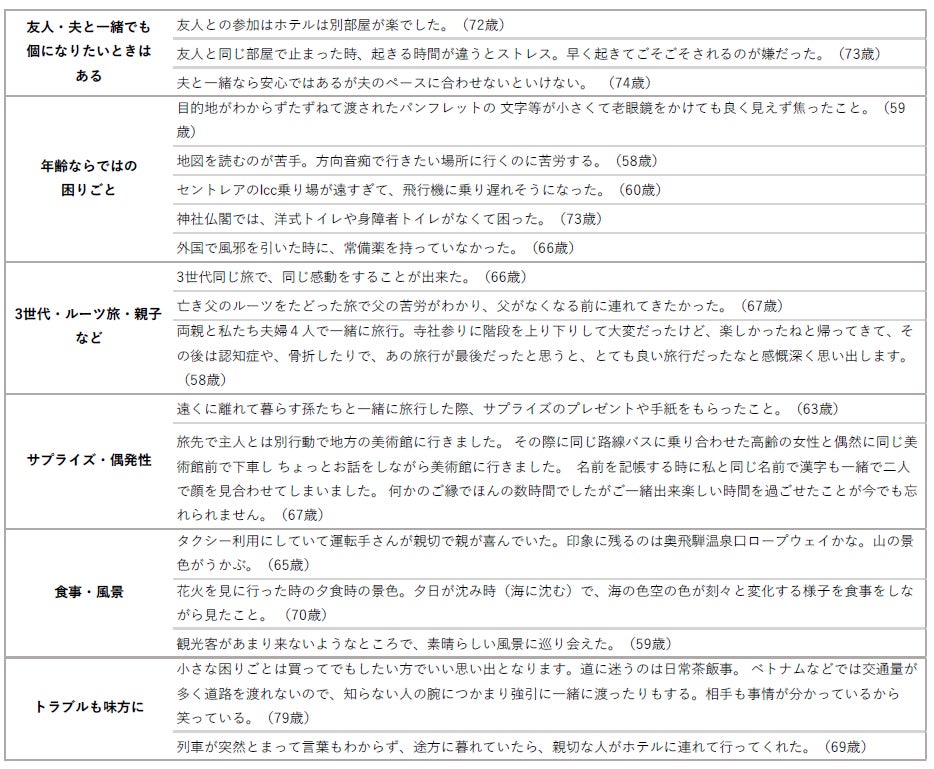 多くの経験をしてきた旅行ベテラン世代だからか、旅行に対するわがままな欲求や相反する要望も挙ります。「自由な旅行は不安だが、仕込み旅行にはストレスがある」「ツアーはラクだが集団行動に抵抗ある」「友人との旅は気楽だが部屋は一人ずつがいい」など。遂には、「感動体験もトラブルもたくさんありすぎて思い出せない」というのです。「忘れてしまった」コメントは複数みられました。こちらも、世代ならではの素直な記述。「矛盾する要望を解決」「旅行の後でも感動体験を可視化」など、当該世代の旅の満足度を高める施策はまだありそうです。