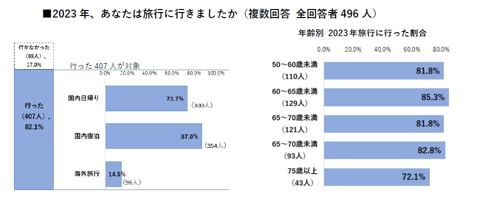 ⇒全回答者496人の82.1%(407人)が、「2023年に旅に出かけた」と回答。うち、国内日帰り旅行は73.7%、国内宿泊旅行は87.0%、海外旅行は14.5%が経験している。