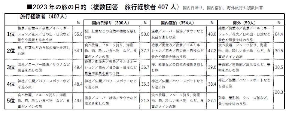■2023年に旅に出た407人の旅の目的は、1位「景色や風景を味わう旅」55.8%、2位「桜、紅葉などの自然の植物を慈しむ旅」54.1%、3位「温泉/スーパー銭湯/サウナなど風呂を楽しむ旅」49.4%。