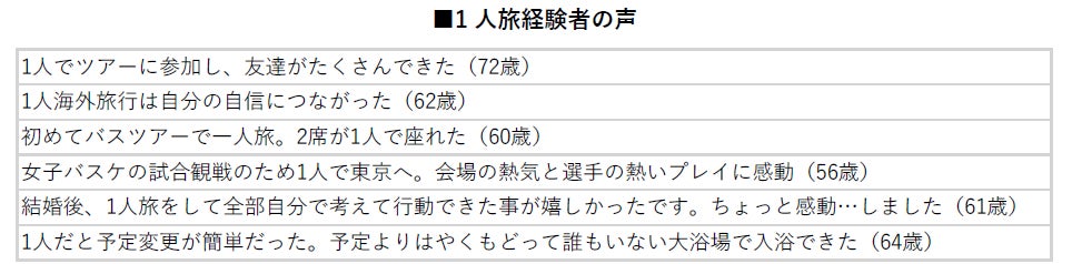 ・自由記述では「1人でツアーに参加し、友達がたくさんできた」(72歳)、「1人海外旅行は自分の自信につながった」(62歳)、「初めてバスツアーで1人旅。2席が1人で座れた」(60歳)、「女子バスケの試合観戦のため1人で東京へ。会場の熱気と選手の熱いプレイに感動」(56歳)など、1人旅に満足している様子が伺えた。