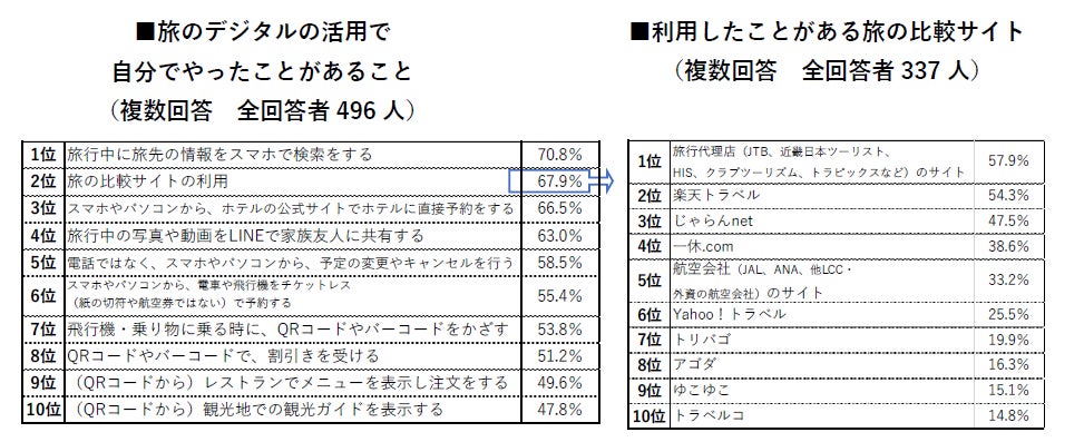 ・「(旅のデジタル活用について)自分でやったことがある」事の上位は、「旅行中に旅先の情報をスマホで検索をする」が70.8%、「旅の比較サイトの利用」が67.9%、「スマホやパソコンから、ホテルの公式サイトでホテルに直接予約をする」が66.5%。