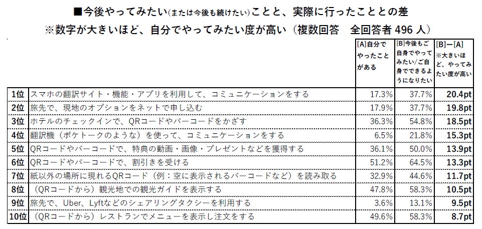 ⇒今後試してみたい(今後も続けたい)ことと、実際に行ったことの差が大きい(数字が大きいほど、自分でやってみたい度が高い)のは、「スマホの翻訳サイト・機能・アプリを利用して、コミュニケーションをする」が20.4ポイント差、「旅先で、現地のオプションをネットで申し込む」が19.8ポイント差、「ホテルのチェックインで、QRコードやバーコードをかざす」が18.5ポイント差であった。