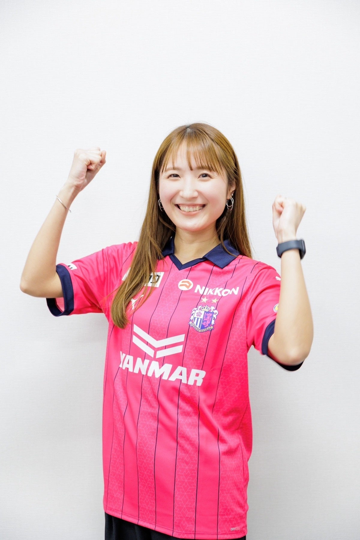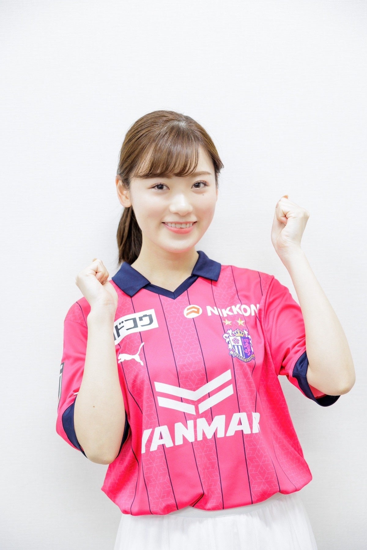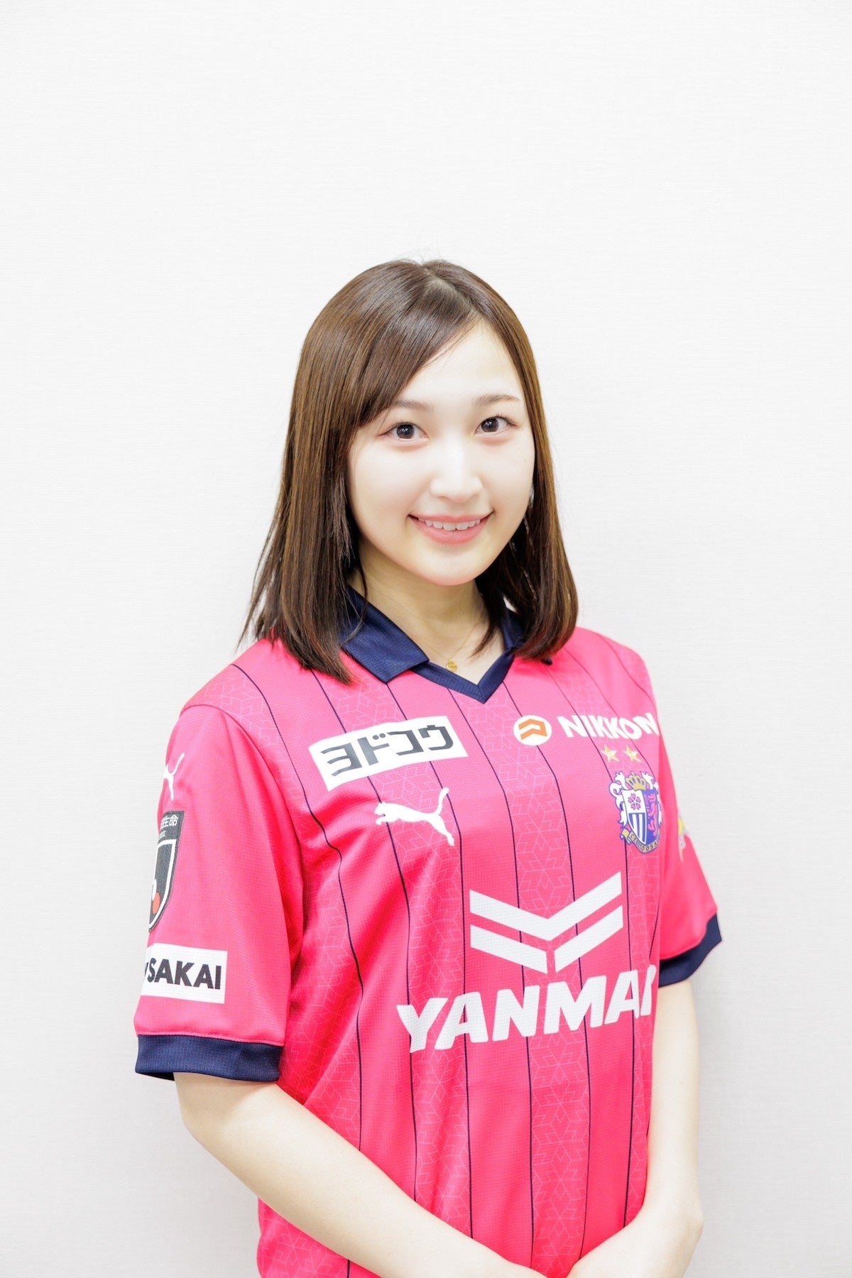 「はじめまして、万徳充穂です。この度2023シーズンセレッソガールに就任いたしました。大好きな桜カラーのユニフォームを着て、皆様と1年間セレッソ大阪を盛り上げていきたいと思っています。スタジアムでお待ちしております!」