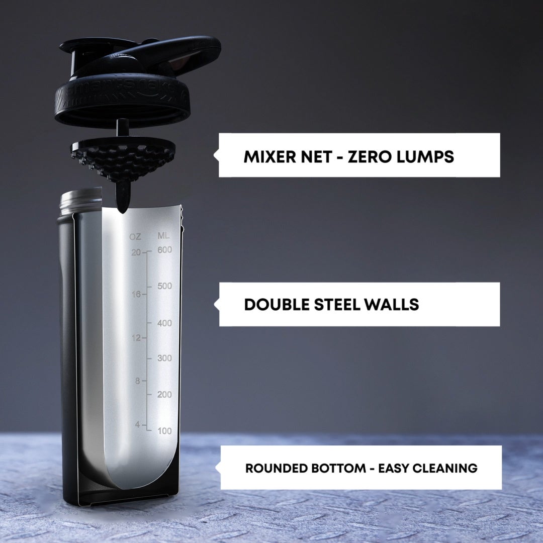 人体工学に基づいた取っ手にプロテインパウダーがダマになりにくくするストレーナが―が付属(MIXER-NET)