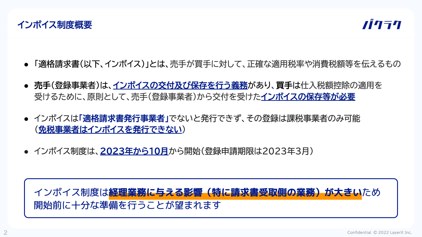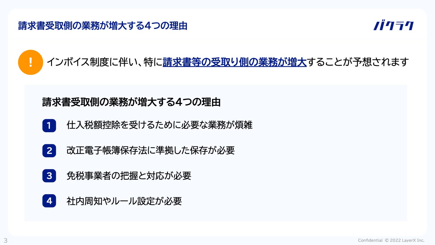 株式会社LayerXが提供する請求書受領ソフト「バクラク請求書」をはじめとしたバクラクシリーズは、2023年10月1日に開始される適格請求書等保存方式(以下「インボイス制度」)を見据えて、経理担当者・税理士の方向けの資料「インボイス制度による“請求書受取業務”の影響まるわかりガイド」を公開しました。