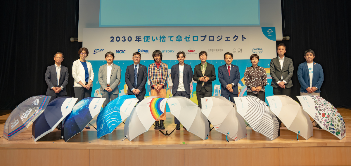 雨の日を快適にハッピーにする傘のシェアリングサービス「アイカサ」を運営する株式会社Nature Innovation Group(本社:東京都渋谷区 代表取締役:丸川照司、以下アイカサ)は、使い捨て傘ゴミの削減を目指す「2030年使い捨て傘ゼロプロジェクト」を大手企業8社とともに立ち上げます。SDGs達成期限の2030年、今まで社会的に大きく問題視されていなかった傘の使い捨て問題を、日本で初めて企業間が一丸となって本気で使い捨て傘ゼロを目指すアクションを開始。世界でワースト1位となっている日本の傘消費と使い捨て文化を脱却すべく、大手企業が率先して傘シェアを導入、推進に力を入れます。本プロジェクト開始に先立つ記者発表会ではタレントのryuchell氏がスペシャルサポーターとして応援に駆けつけ、ゴミ清掃芸人のマシンガンズ滝沢氏が司会を務めました。