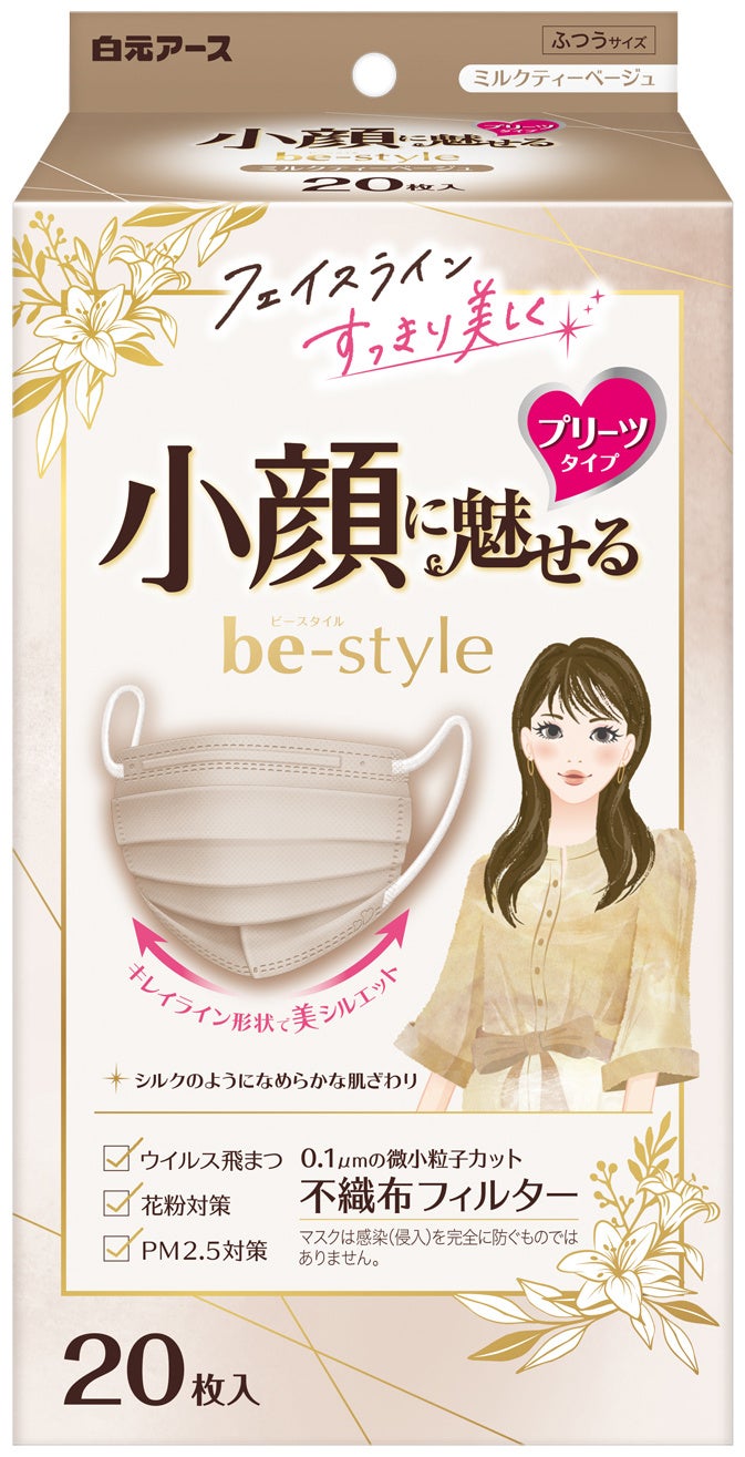 白元アース株式会社(本社:東京都 台東区、社長:吉村一人)は、フェイスラインをすっきり美しく、小顔に魅せるプリーツタイプのマスク『ビースタイル プリーツタイプ ふつうサイズ ミルクティーベージュ20枚入』を3月1日より限定発売いたします。