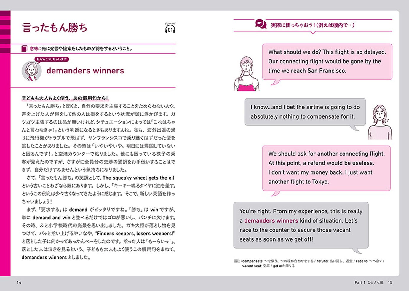 | 【目次】 はじめに Part1 ひとクセ編 収録語:言ったもん勝ち/遠慮のかたまり/客寄せパンダ/そもそも論/土下座 など コラム:kawaiiは日本のカルチャーです!/gender neutralityについて考える Part2 現代語・流行語編 収録語:逆ギレ/ギャップ萌え/中二病/ドヤ顔/ブラック企業/ボケとツッコミ など コラム:擬音語・擬態語、どう訳す? Part3 ことわざ・慣用表現編 収録語:鬼に金棒/出る杭は打たれる/長いものには巻かれろ/猫をかぶる/八方美人/晴れ男・晴れ女 など コラム:語彙の広げ方/作っちゃうまでは苦労の連続 おわりに 表現リスト |