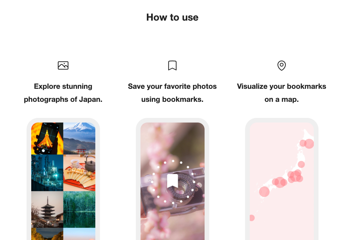 素晴らしい写真の中から、お気に入りの写真をブックマークすることで、あなただけのオリジナルマップが完成します。標準のガイドブックには掲載されていない場所を発見して、自分だけの特別な日本旅行を楽しんでください。