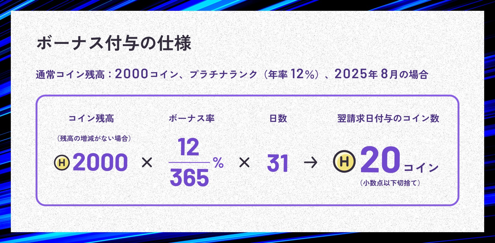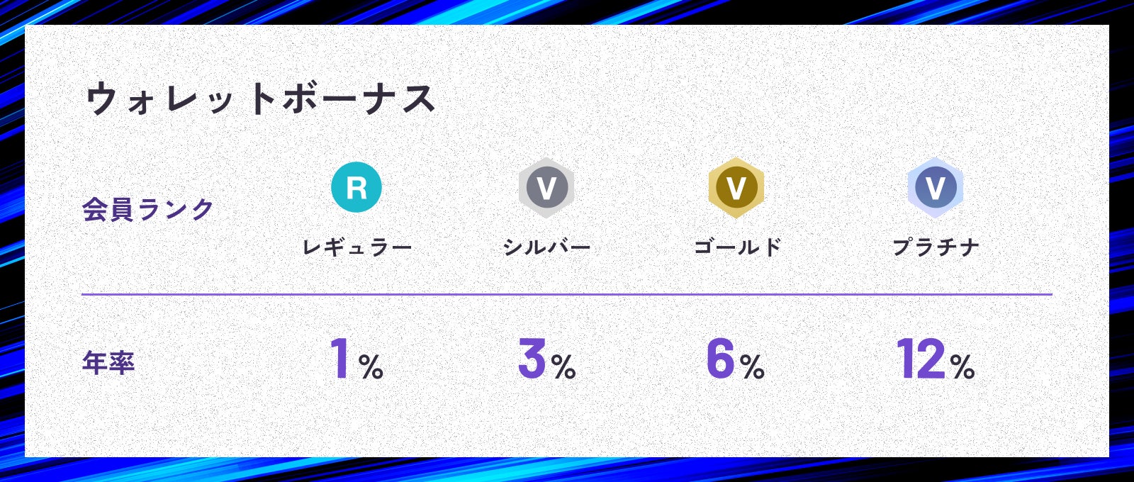 ウォレット機能の導入にあわせて、コイン残高に応じた「ウォレットボーナス」制度も開始。通常コインに対して、年率最大12%のボーナスコインが毎月付与されます。