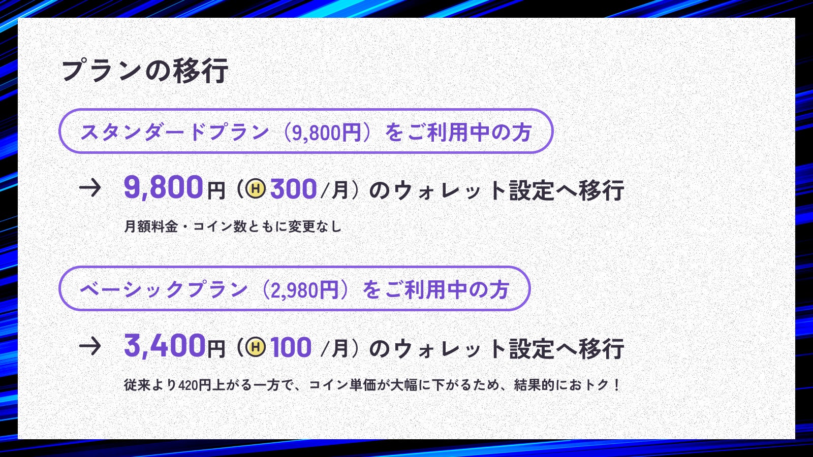 現在のご利用プランは、以下の通り自動的に新しいウォレット設定へと移行されます。