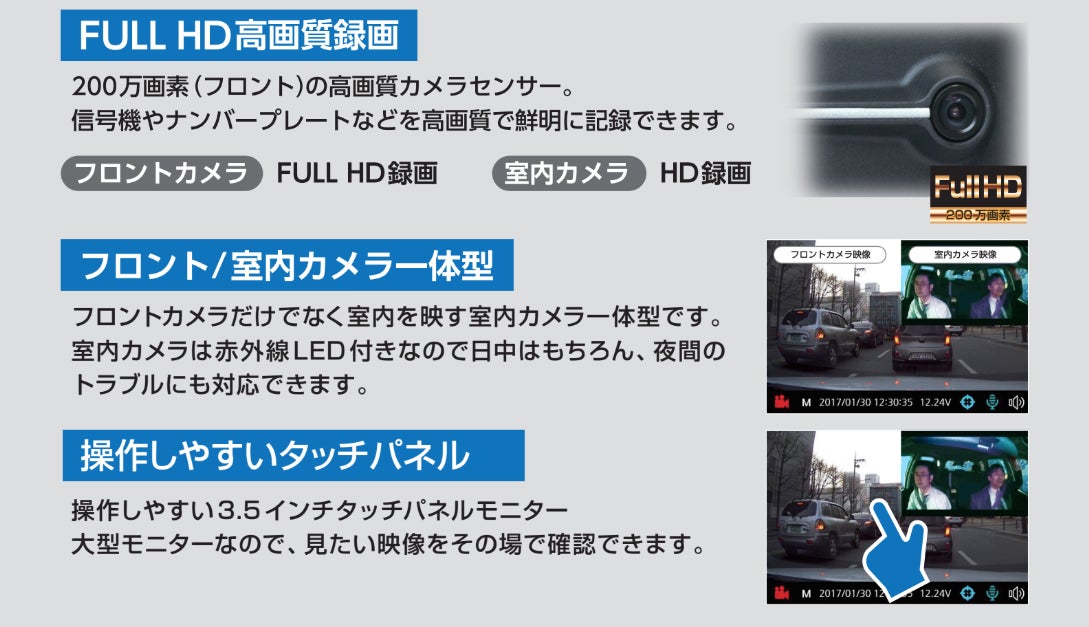 経費に優しいコスパ◎前方車内録画2チャンネルタイプドラレコ10,000円切りで登場!前方と車内の様子をバッチリ録画!運転手の様子が記録でき万が一の時も安心!営業車やタクシー、12V車両の業務用車両に!
