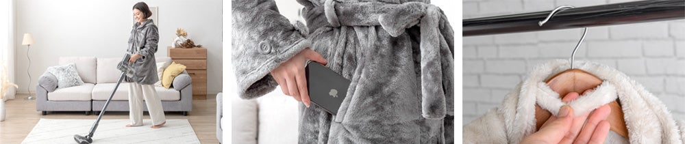 (写真左:ショート丈にもできる着る毛布/ 中央:便利な両ポケット付き /右:ハンガーにも掛けやすいハンガーループ付き)