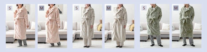 (写真左:ベルトを外すとゆったりとしたルームウェアに/ 中央:フードと襟付きで全身の温かさをキープ /