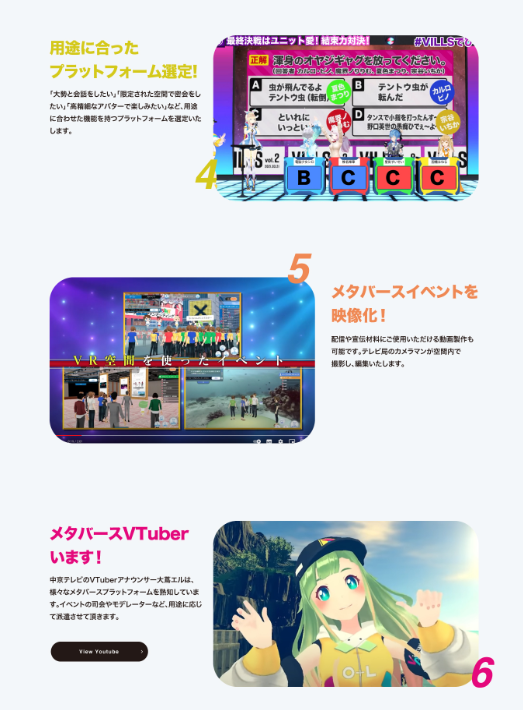 これまで番組やイベント制作で培ってきた企画制作力と、豊富なメタバースイベントの実績を活かし、メタバース活用による企業の課題解決から、新しいエンターテインメントの創出をバックアップしていきます。