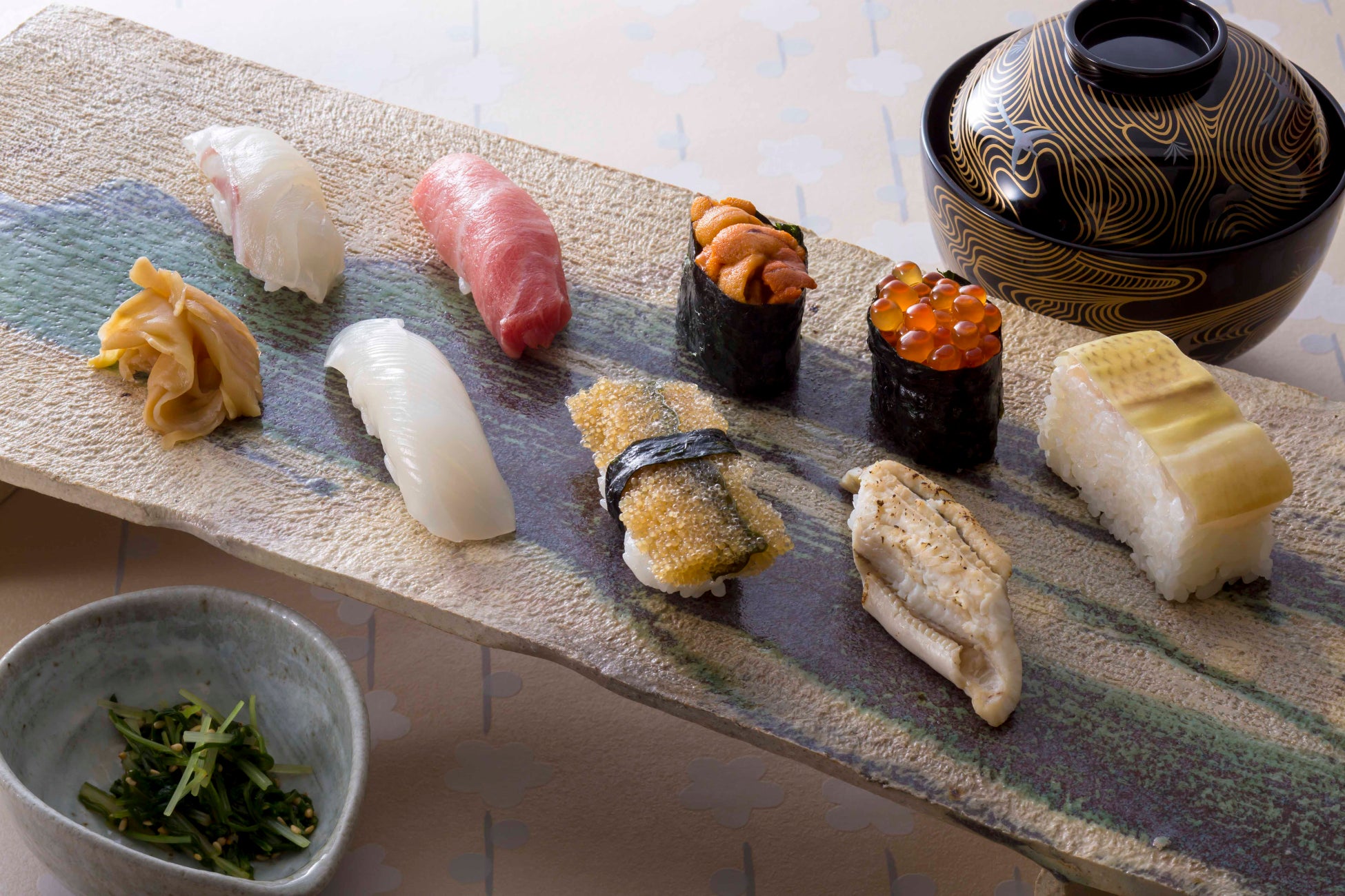 北海道の生雲丹やいくら、縁起も味も良い鯛や子持ち昆布、本鮪とろ、煮穴子、イカなど人気のにぎりと、名物の小鯛雀鮨が一堂に。価値ある昼膳をこの機会にぜひ。