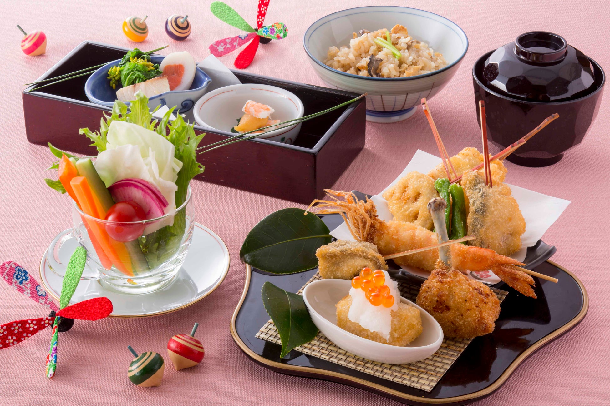 串あげは、餅のいくら掛けや海老など、新春を祝う8 種がラインナップ。旬味豊かな先付やサラダ、季節の炊き込みご飯など冬の馳走を存分にお愉しみください。