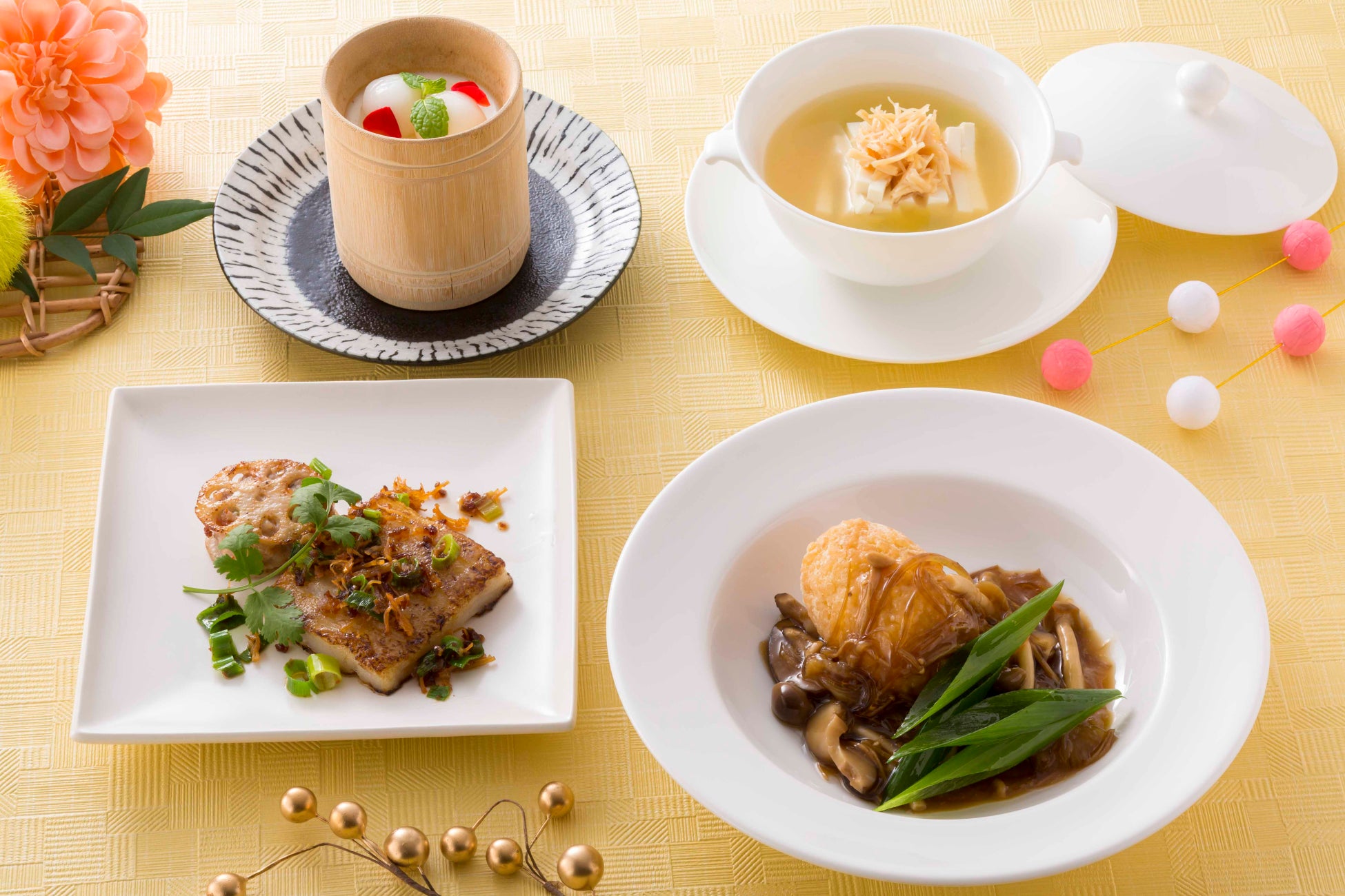 大根餅や蓮根餅など縁起の良い正月料理に、干し貝柱・白菜・兵庫の地豆腐入りのスープや豚バラ肉の土鍋煮込みといった温メニューが緩急よく登場。チャーハンで作る「揚げおにぎりのフカヒレあんかけ」などシェフ特製アレンジ料理もお愉しみに。