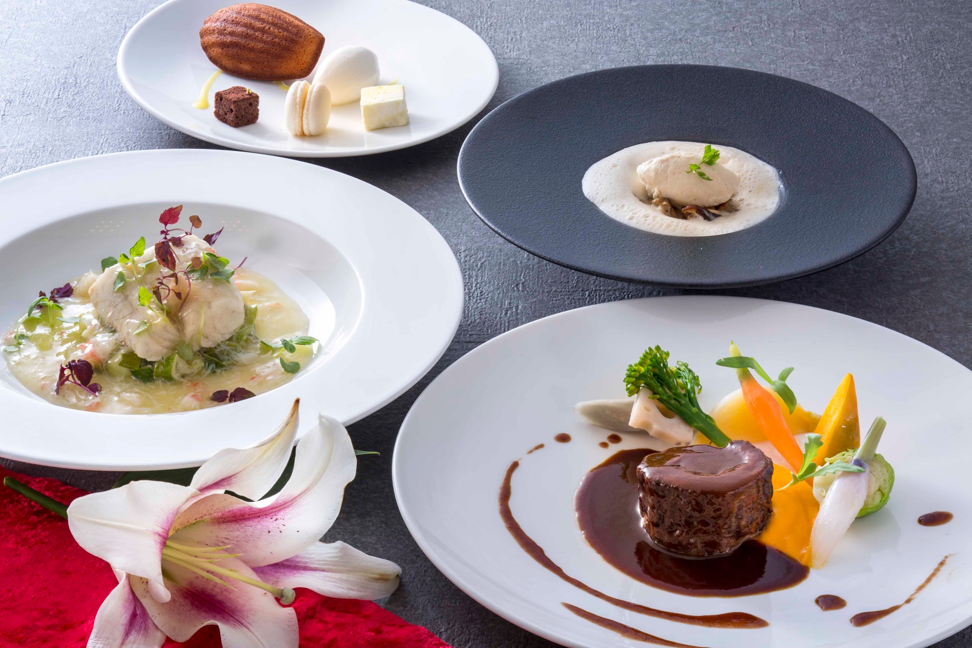 彩味溢れるアミューズ、播州赤鶏の旨みたっぷりのカプチーノ仕立てのスープのほか、メインは、岩津葱や香住産紅ズワイ蟹と合わせた旬魚の蒸し焼きか、牛肉赤ワイン煮込みからお好きなものを。新年を祝う華やかなコースをご堪能ください。