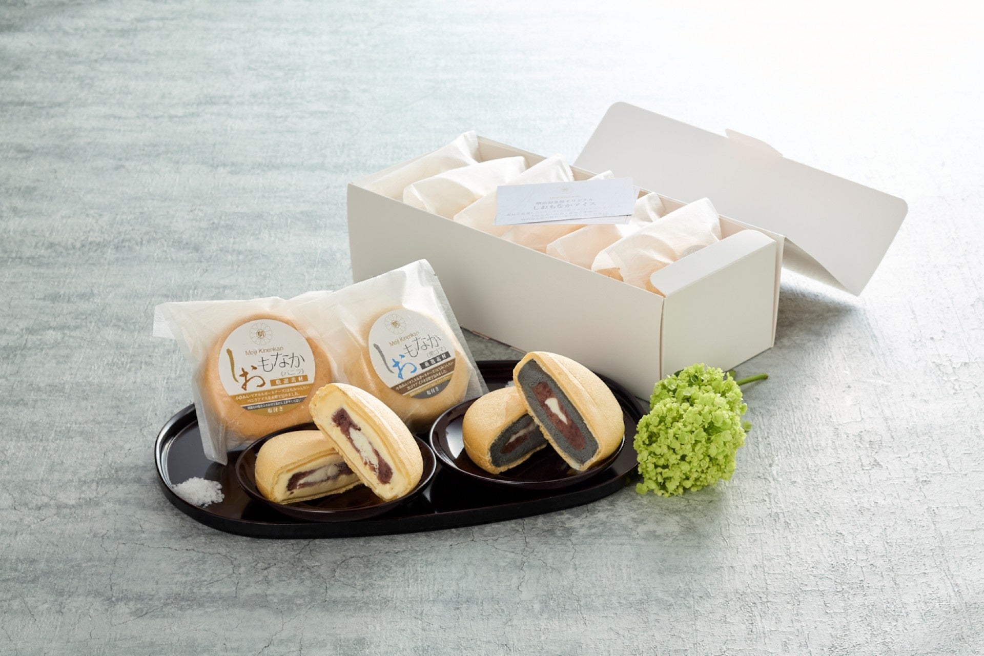 オンラインショップ限定の「しおもなかアイス(3240円・税込※別途送料)」は、はちみつ入りのマスカルポーネチーズを小倉あん、求肥ともち米100%の皮で包んだ、バニラと黒ゴマの二種類の絶品アイスです