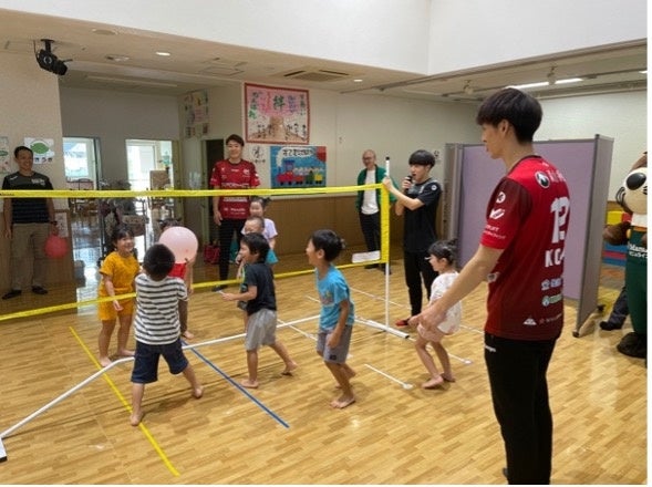 ミニバレーボールで遊ぶ子どもたちと戸田選手(左)、古賀選手(右)