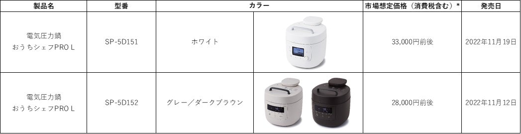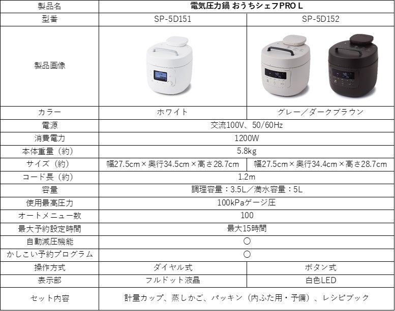 シロカ株式会社(東京都・千代田区)は、電気圧力鍋 おうちシェフシリーズに、大容量かつさらに幅広い調理に対応した新シリーズ「おうちシェフPRO L」を追加し、2022年11月12日にSP-5D152を、2022年11月19日にSP-5D151を発売します。