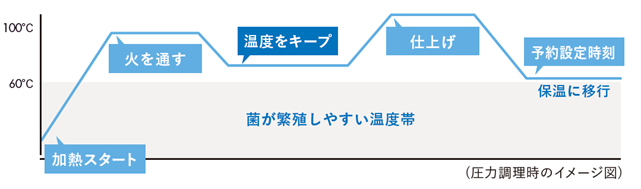 「かしこい予約プログラム」*2なら、最初に加熱し、菌が繁殖しにくい約75℃で保温するから、食材が傷みやすい時季の長時間予約も衛生的です。さらに、設定時間から逆算して仕上げ調理に取りかかり、味をしみ込ませてから完成と、おいしさも妥協しません。
