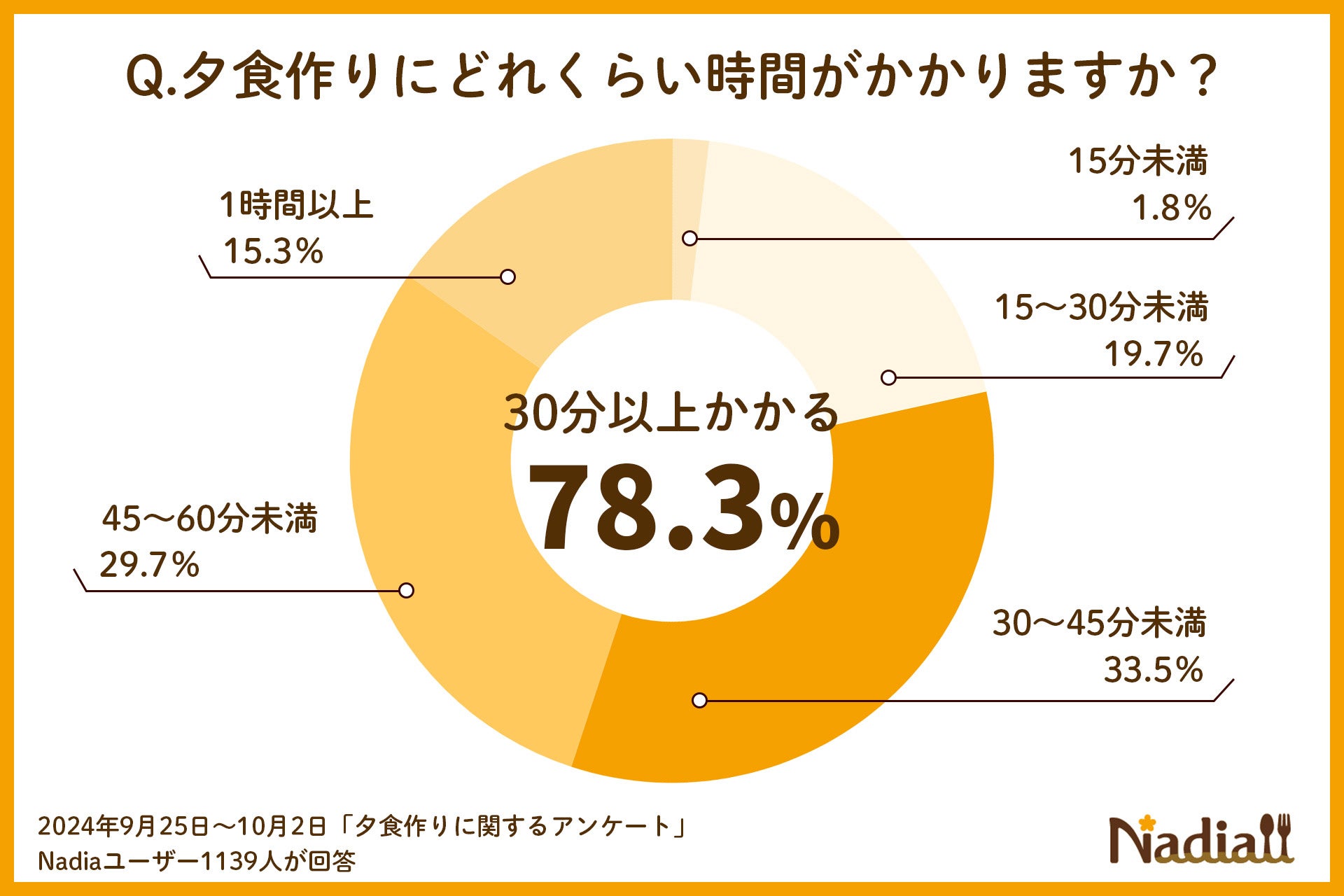 78.5%の方が「夕食作りに30分以上時間がかかる」と回答。「時短・簡単」、「食材の使い切り」、「献立決め」が夕食作りのカギ!