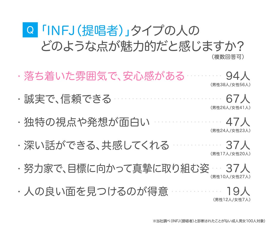続いて、「INFJ(提唱者)と診断されたことがない成人男女100人」を対象に、INFJ(提唱者)のどのような点に魅力を感じるか尋ねました。