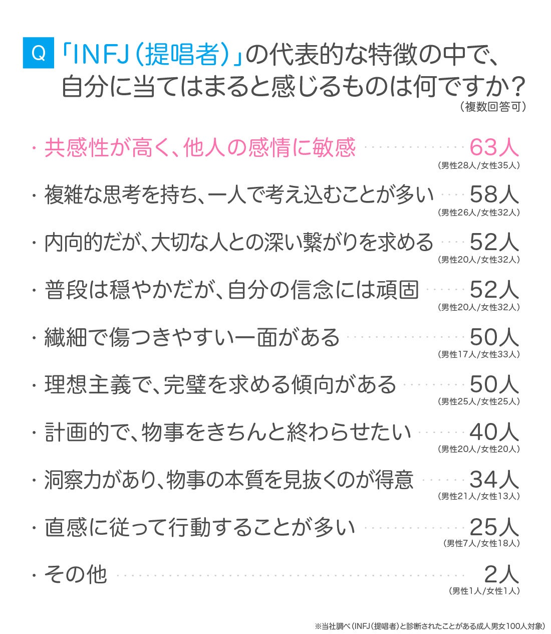 INFJ(提唱者)と診断された経験のある成人男女100人に、INFJ(提唱者)の代表的な特徴の中で、自分に特に当てはまると感じるものを複数回答で尋ねました。