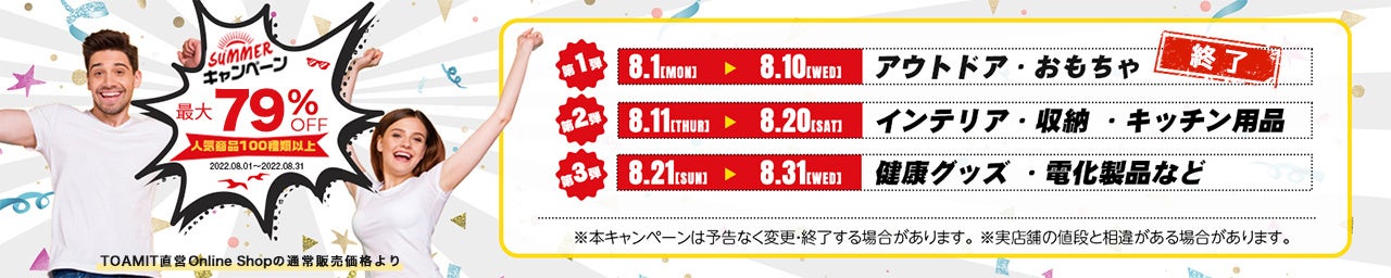 日用雑貨、美容・健康製品などの企画開発・製造を行う株式会社東亜産業(本社:東京都千代田区、代表取締役:深井昭匡、以下東亜産業)は、2022年8月1日(月)からTOAmart オンラインショップ(https://toamart.jp/)にてSUMMER キャンペーンイベントを実施しています。