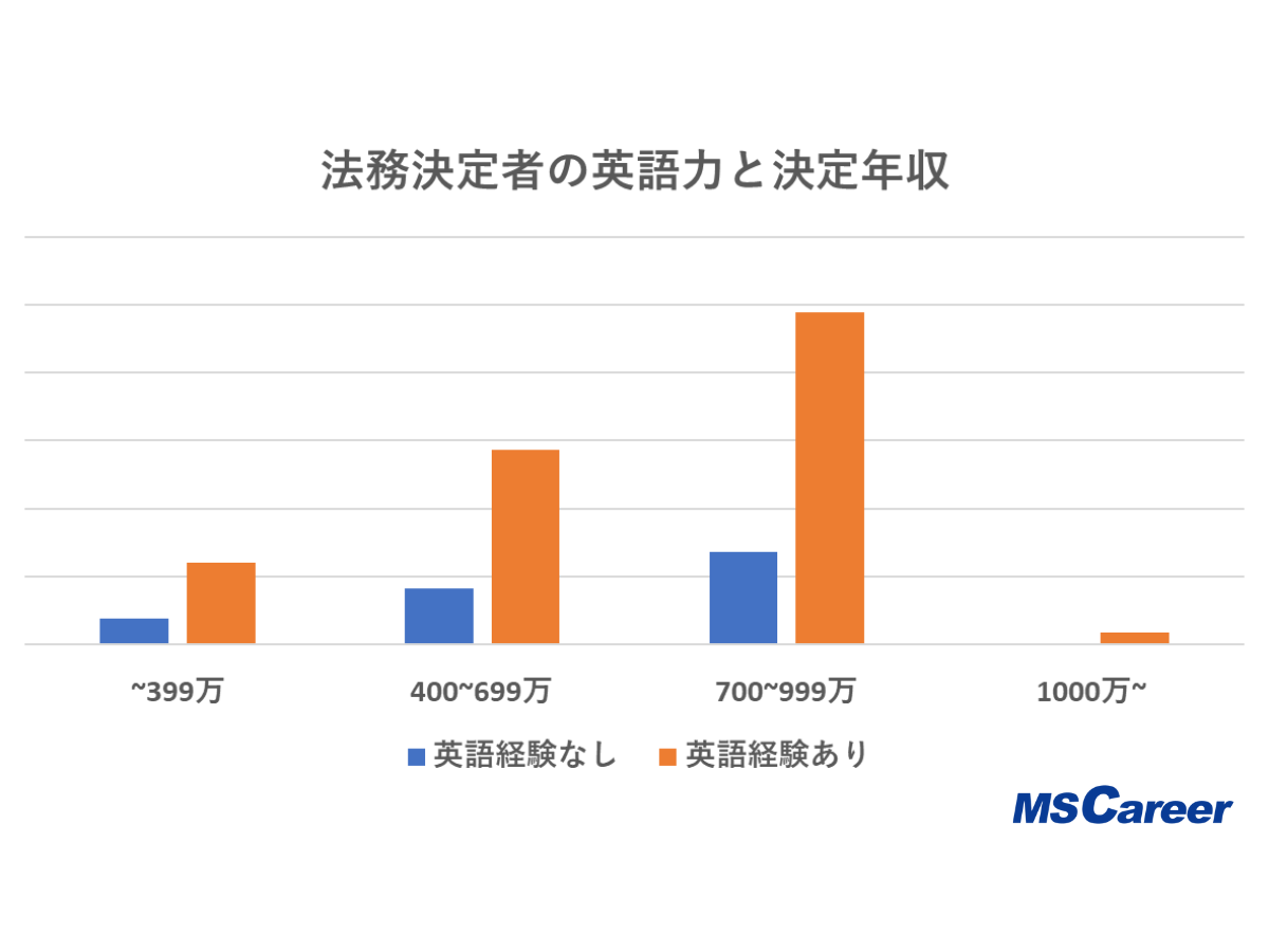 一方で、法務職への転職決定者のうち、英語経験なしの平均年収が504.6万円、 英語経験ありの平均決定年収が569.7万円と、英語経験によって決定年収が高くなることが確認されました。
