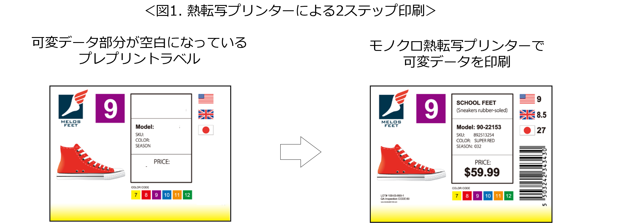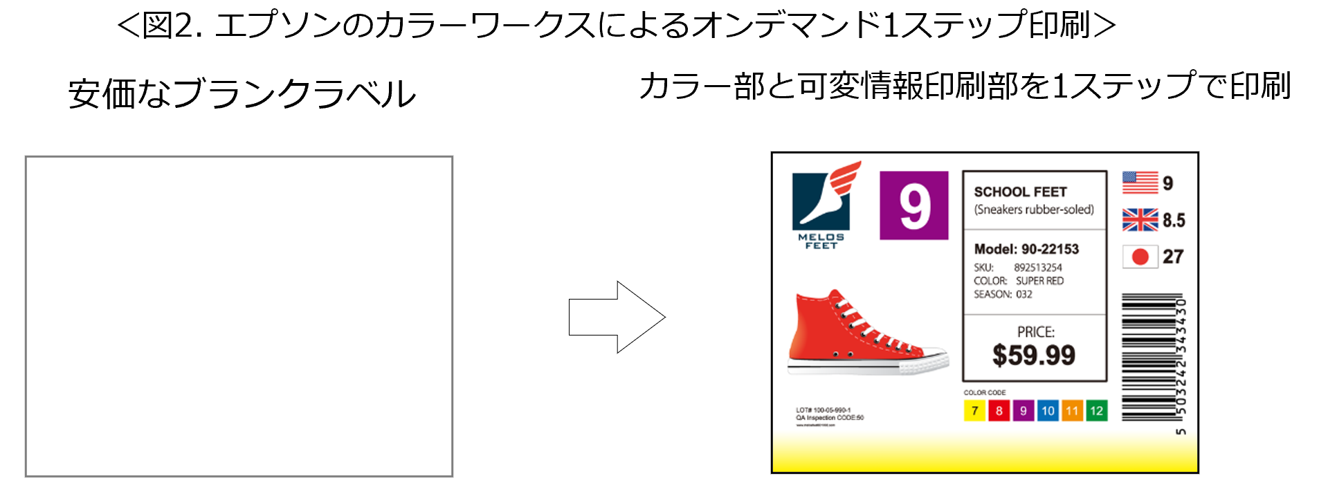これまで2ステップ印刷(図1)でカラーラベルを発行していた企業は、1ステップカラーオンデマンド印刷(図2)に移行することで、コスト削減やエラー低減が可能になります。この1ステップ印刷はエプソンのカラーラベルプリンターと、ロフトウェアのナイスレーベルクラウドのソフトウェアプラットフォームとの組み合わせで実現されます。