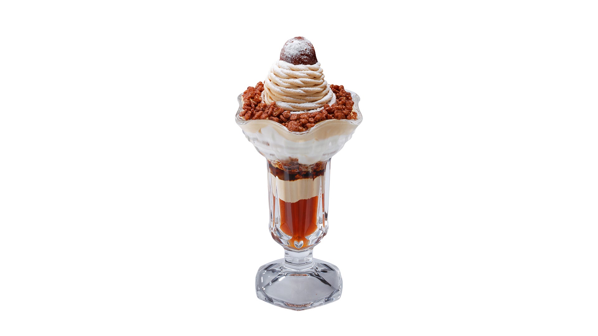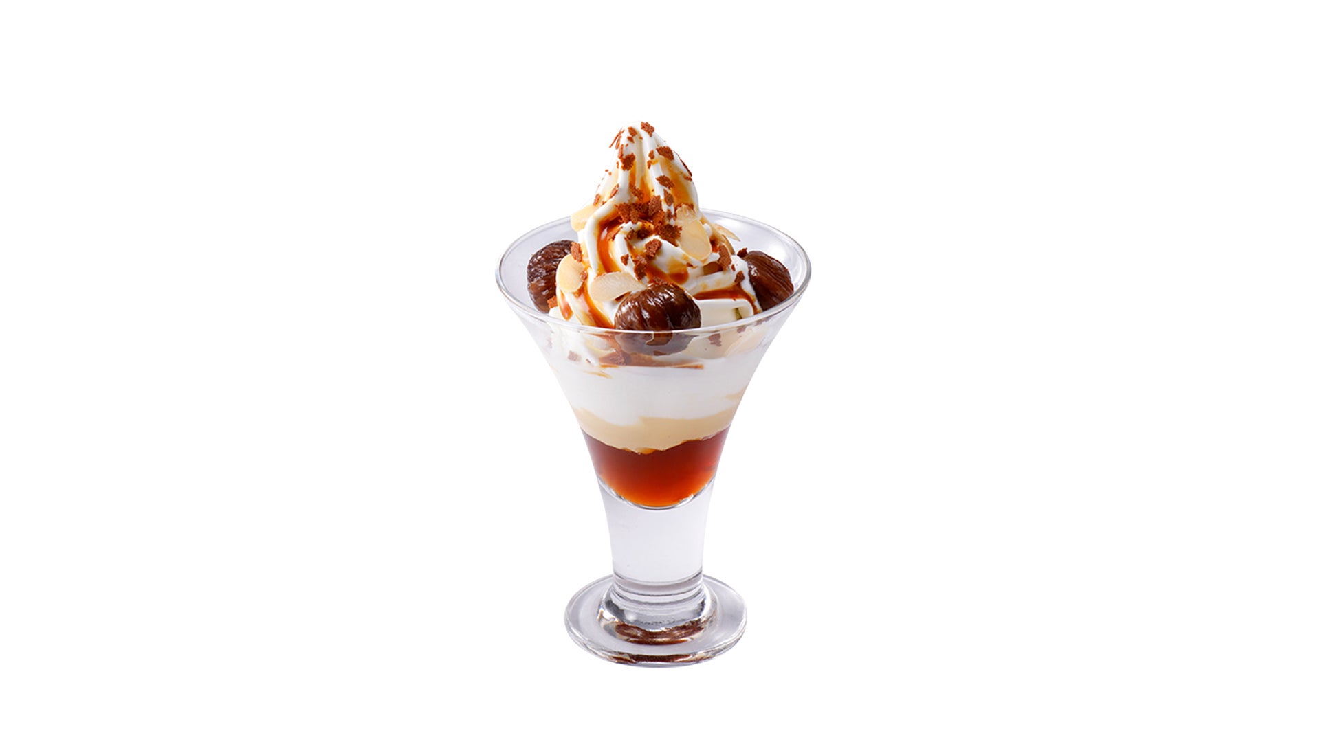 塩キャラメルクリームと北海道ソフトクリームにマロンとビターキャラメルソースを組み合わせた、食後にぴったりな小さめサイズのデザートパフェです。