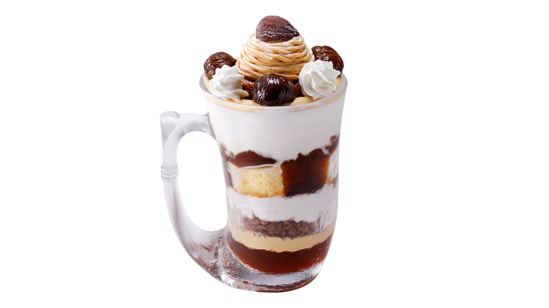 たっぷりサイズの「ジョッキパフェ(マロン)」では、「モンブランパフェ」のトッピングに加え、バニラアイスやシフォンケーキなどを大きなジョッキに詰め合わせた満足感のある一品です。家族や友人とシェアをしながら愉しむこともできます。