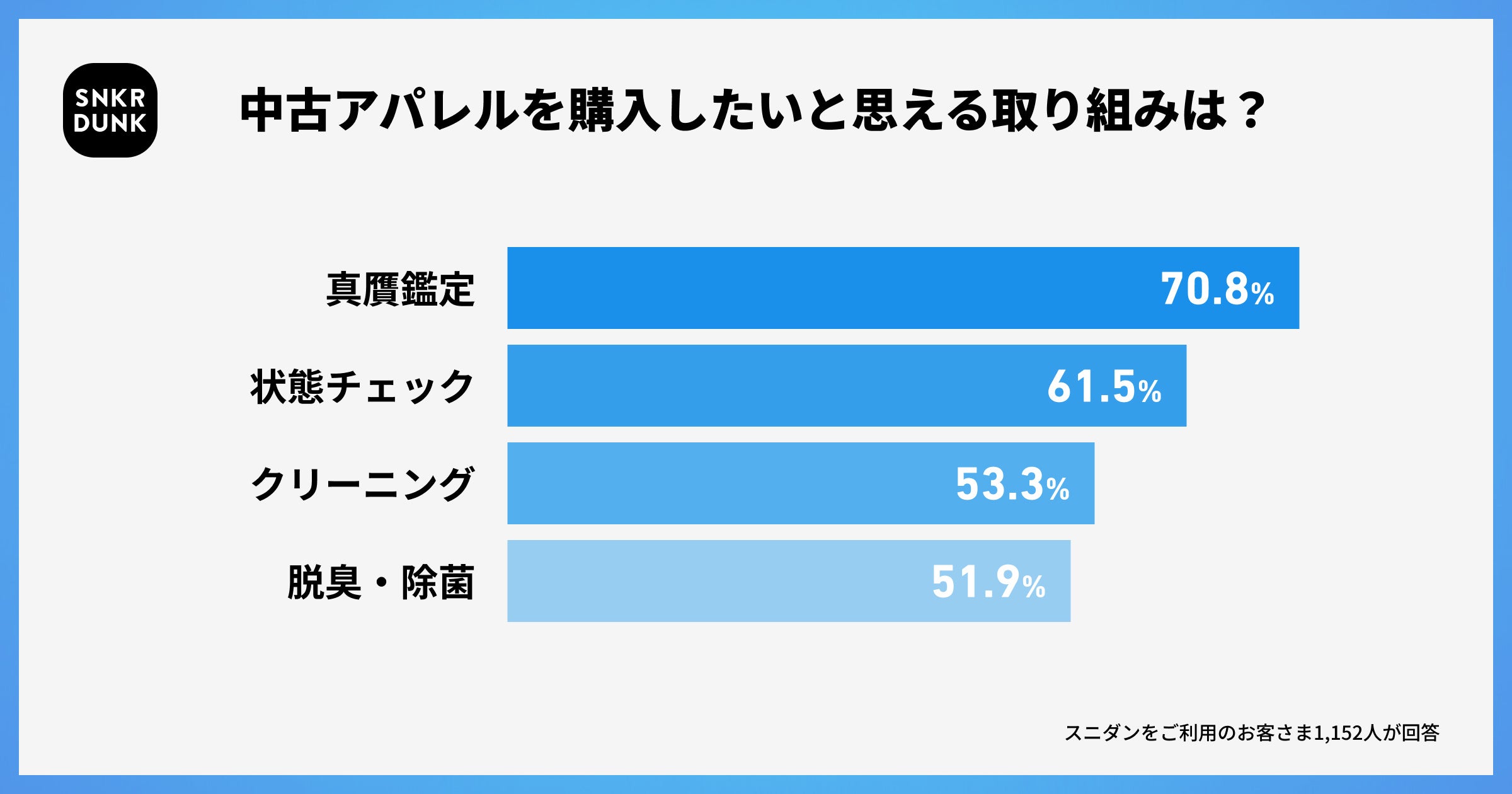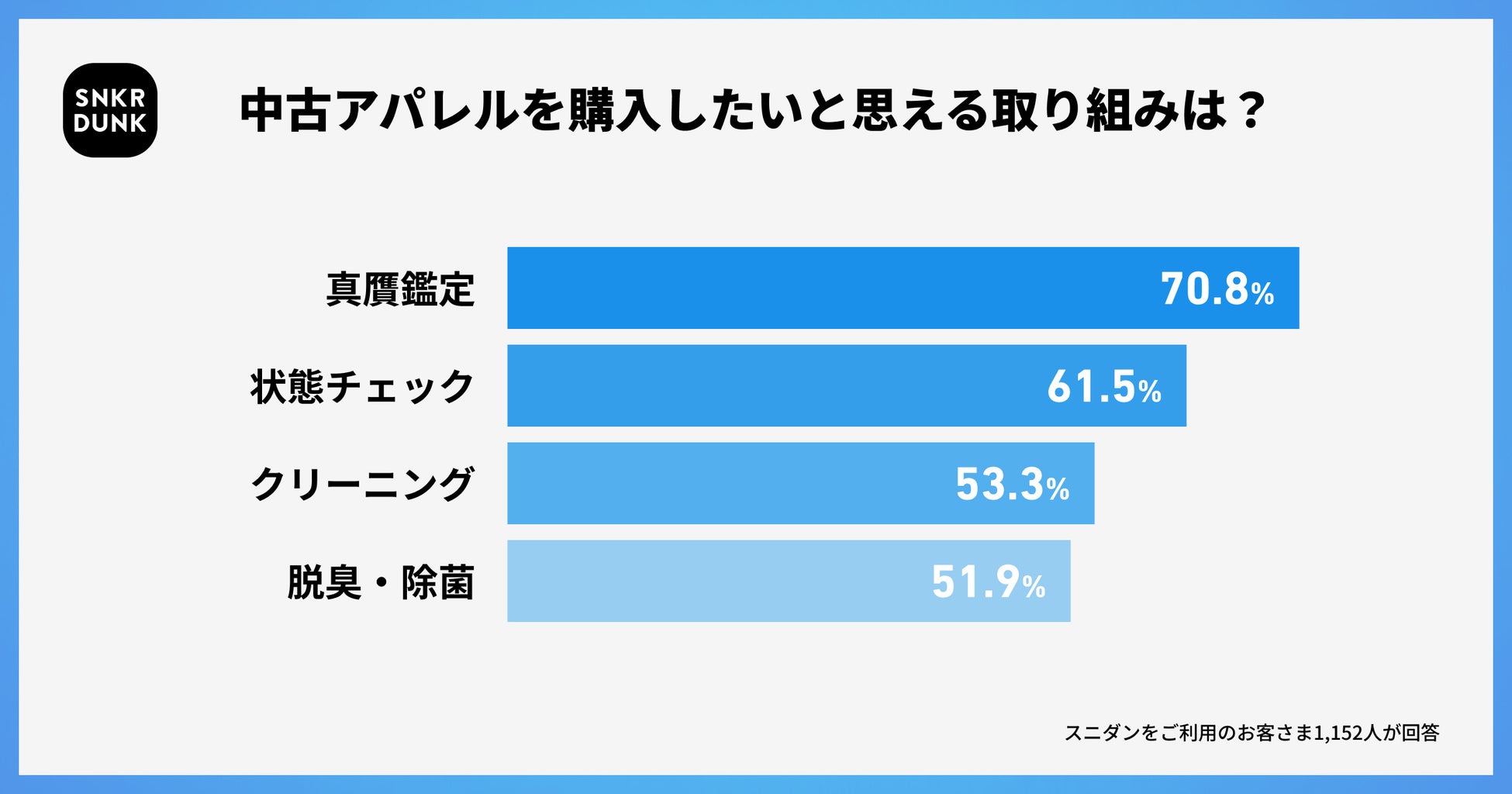 さらに、スニダンがお客さま向けに実施した「中古アパレルの購入に関するアンケート調査」では、8割以上の人が「状態が良ければ中古品の購入に抵抗がない」と感じていることがわかりました。