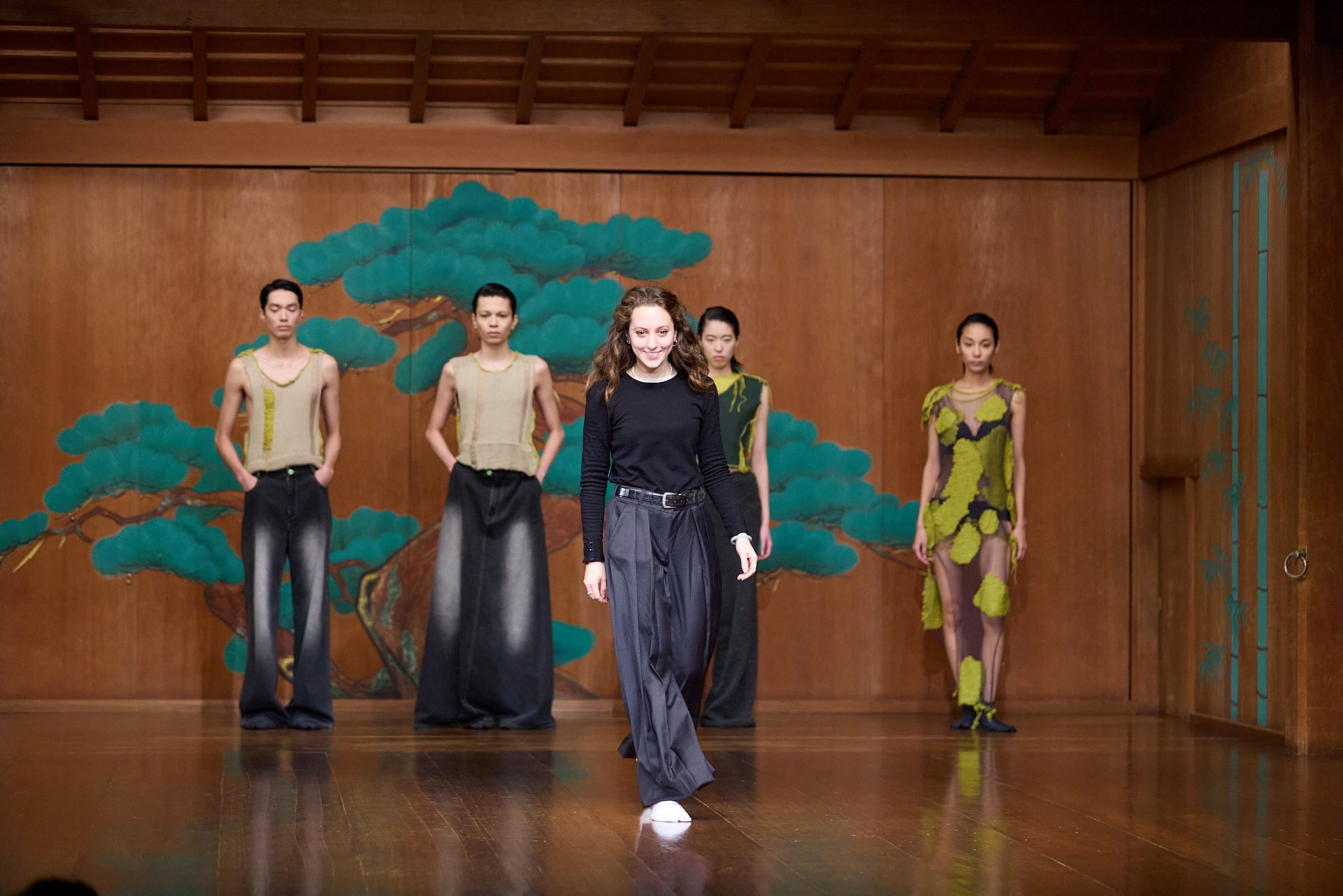 大学ではファッション史を専攻し、教授の紹介で日本のファッションの世界を弁しました。そんな憧れの国で、美しいモデルの方々によってみなさんにわたしの思い入れのある作品を紹介できるすばらしいチャンスを与えていただいたことにとても感激している。自由自在に創造できる私が大好きなニットをポイントとして体を包み込みながら、それと同時にボディを際立たせる滑らかなラインをポイントにしました。今日という日がわたしの日本でのキャリアを築く第一歩になると願っています。