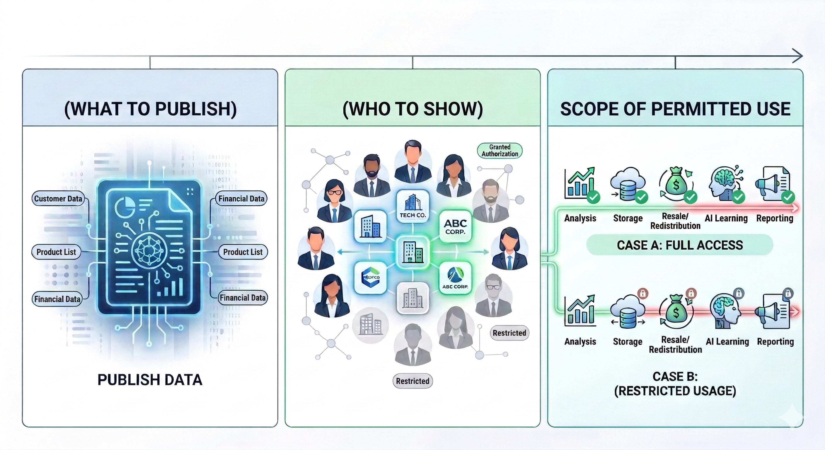 本特許により、資産や属性情報について、何を公開し、誰に見せ、どの範囲で使わせるかを、条件付きで管理できるようになります。その結果、利用条件が曖昧なまま資産が流通し、後から紛争になる状態を減らせます。