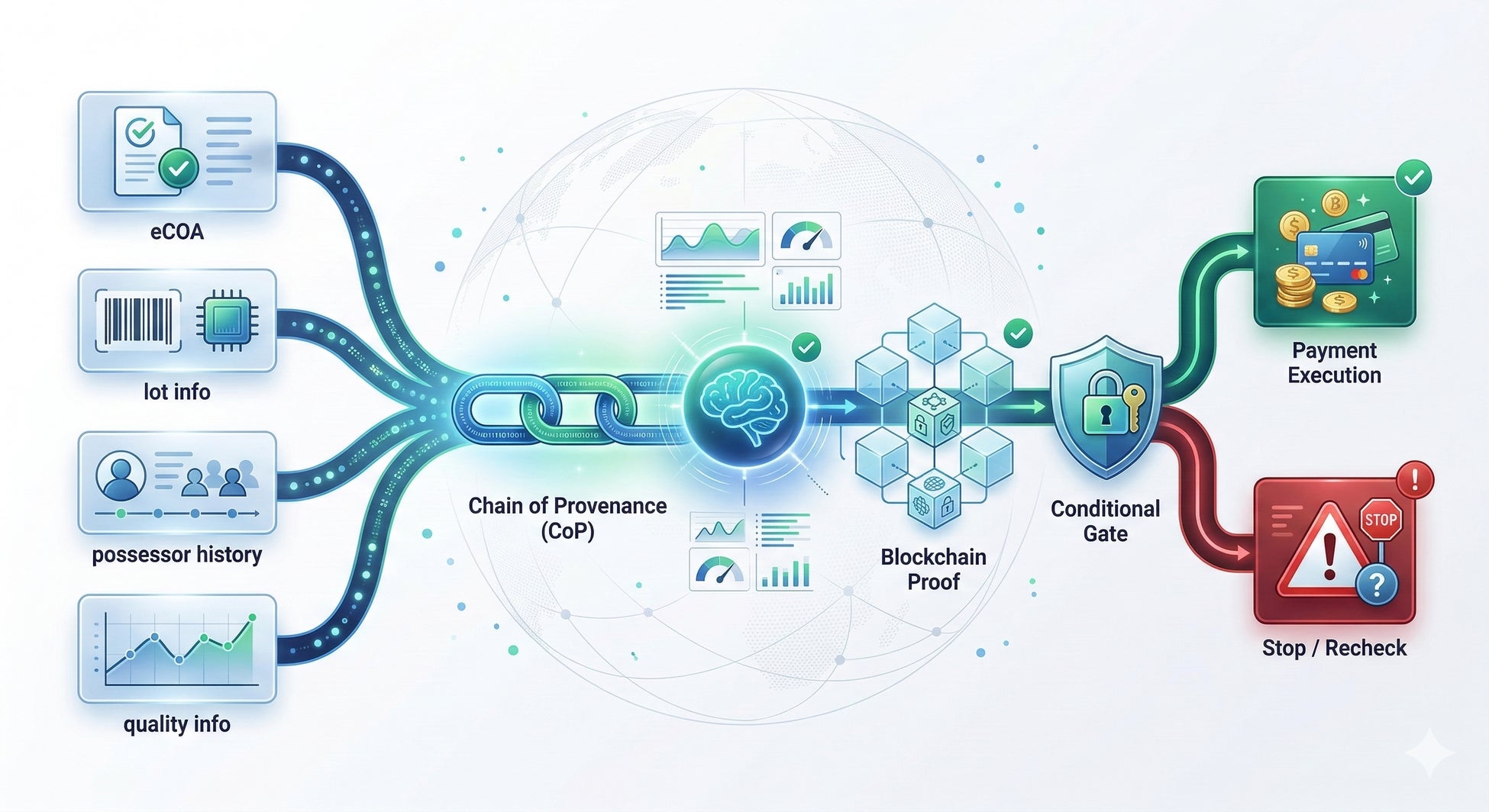 サイカルトラストの「特許群」×「ISO 26345」により、資産の流れと真正性(トラスト)を検証可能な証跡として確認し、その結果に応じて”ステーブルコイン”による自動決済を実行または保留できるようになります。これにより、半導体材料、高額ブランド商品、その他重要部材等において、取引の安全性と速度を同時に高めることが可能になります。