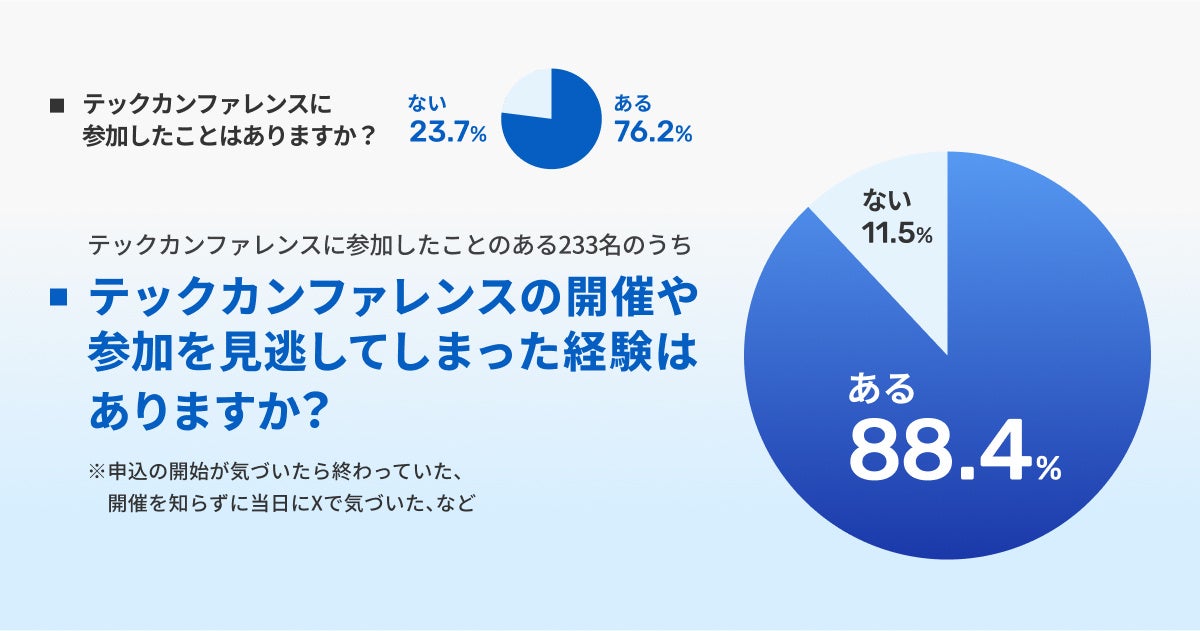 一方で、国内外には数多くのテックカンファレンスが存在しています。当社の調査によると、これまでテックカンファレンスへの参加経験がある方は全体の76.3%でした。そのうち「気づいたらテックカンファレンスの開催が終わっていた」という経験がある方が、回答者の88.4%いることがわかりました。また「テックカンファレンスに関する情報収集法」は、最も多い回答がX(旧Twitter)の78.1%でした。(※3)