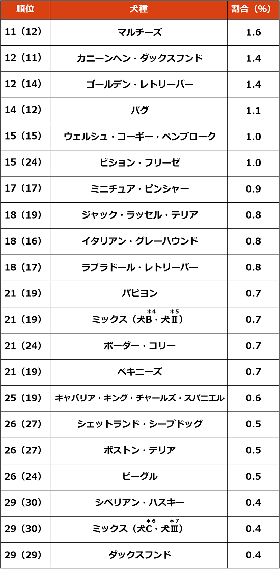 飼育猫種ランキングでは多くランクインする長毛種ですが、飼育犬種ランキングでは長毛種と短毛種がほぼ半々のランクインとなっている点が特徴的です。