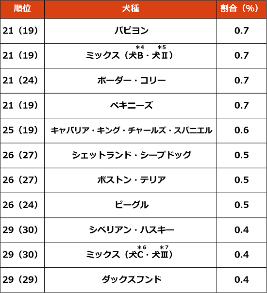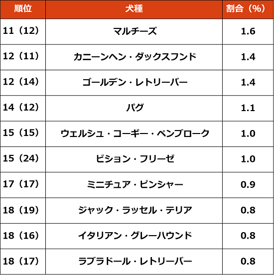 5位「ポメラニアン」と6位「ミニチュア・ダックスフンド」の間で順位の入れ替わりが見られたものの、1位から10位までにランクインした犬種は2017年の調査開始以来不動となっています。