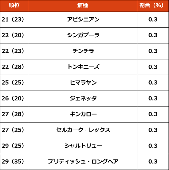 「トンキニーズ」が昨年の28位から22位へ、「ブリティッシュ・ロングヘア」が昨年の35位から29位へと大幅に順位を上げました。「トンキニーズ」は筋肉質でがっしりとした体形の猫で、体毛の手触りがミンクのように、とても滑らかなことが特徴的です。また、人間はもちろん他のペットともうまく過ごすことのできる子が多いと言われています。「ブリティッシュ・ロングヘア」はやや大きめの豊かな長毛が特徴の猫です。悠然とした態度でどことなく貫禄があり、活発というよりは落ち着いて過ごすタイプの子が多いため、在宅勤務などをしていても飼育しやすい面があるのかもしれません。
