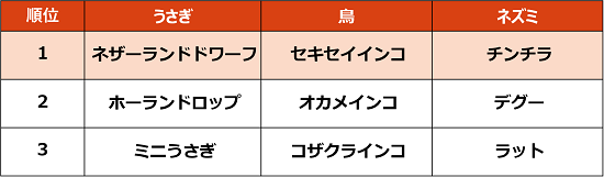 「うさぎ」「鳥」「ネズミ」のランキングでは、1位から3位まで昨年同様の順位となりました。