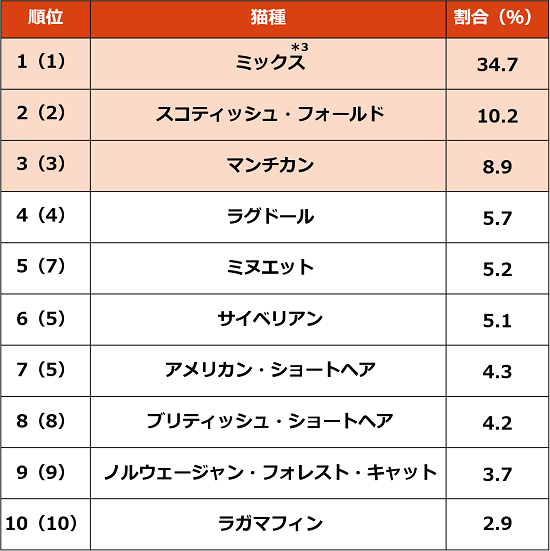 *3 ミックス:純血種同士を組み合わせている猫、日本猫、雑種の猫を含みます